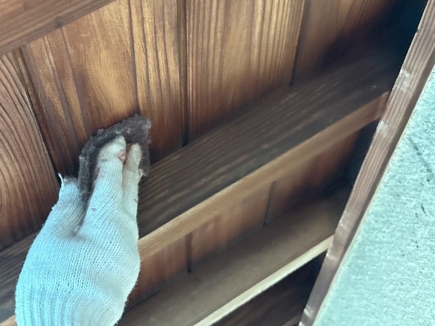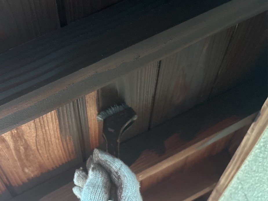 今回の施工では、軒天の色褪せや乾燥による劣化に対し、木部の風合いを活かした塗装を行いました。