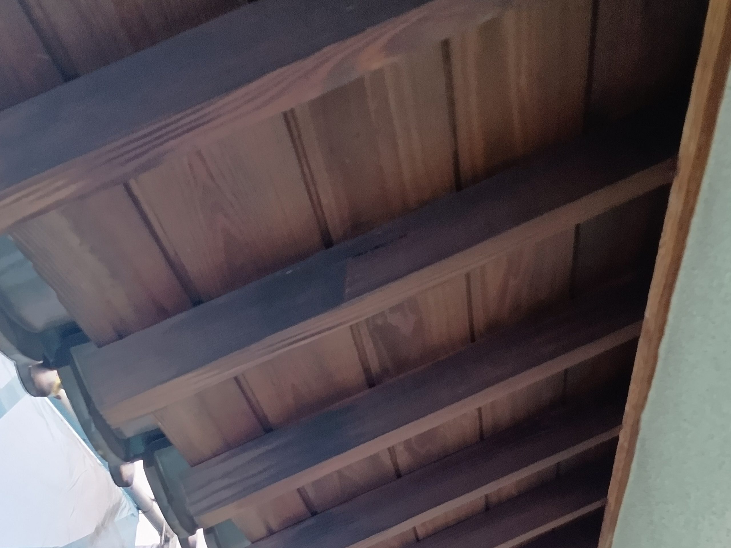 特に垂木や鼻隠し部分では、日当たりの影響による軽微な退色が見られ、木部表面の保護力が徐々に低下している様子が見受けられます。